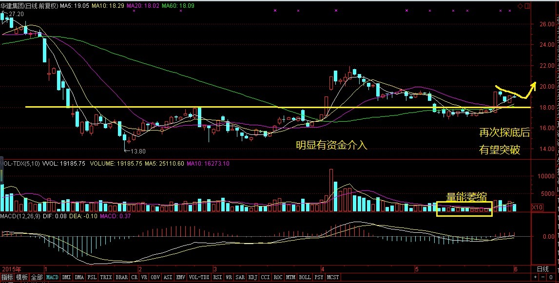 华建集团前2大国有股东持股超过70%,实际流通盘不到9000万股,流通市值不大,便于庄家炒作。去年6月末以来公司股东人数一直维持在15000户左右,人均持股超过2万股,筹码十分集中。该股股灾前高点45元,目前股价已经腰斩,而股东数变化不大,这是为什么呢?看来长庄对未来有信心!元旦3.0股灾后,华建集团一直在16元左右 平台震荡整理,4月初突然放量拉升,期间有2个涨停,明显有主力吸货。随后该股冲至22元开始回调,量能也极度萎缩。5月26日再度涨停,但量能较以前涨停时大幅缩小,说明主力控盘程度越来越强。近几日大盘强势反弹,华建集团却弱势回调,笔者认为其将在触碰60日线(也可能触碰到10日线就反弹)后开展新一轮上攻行情。当然还有一只可能的情况就是可能会在近期停牌,因为该股近20个交易日平均股价不高,比较适合停牌。至于会注入什么资产,我不是上海的领导,不敢在这里胡言乱语。