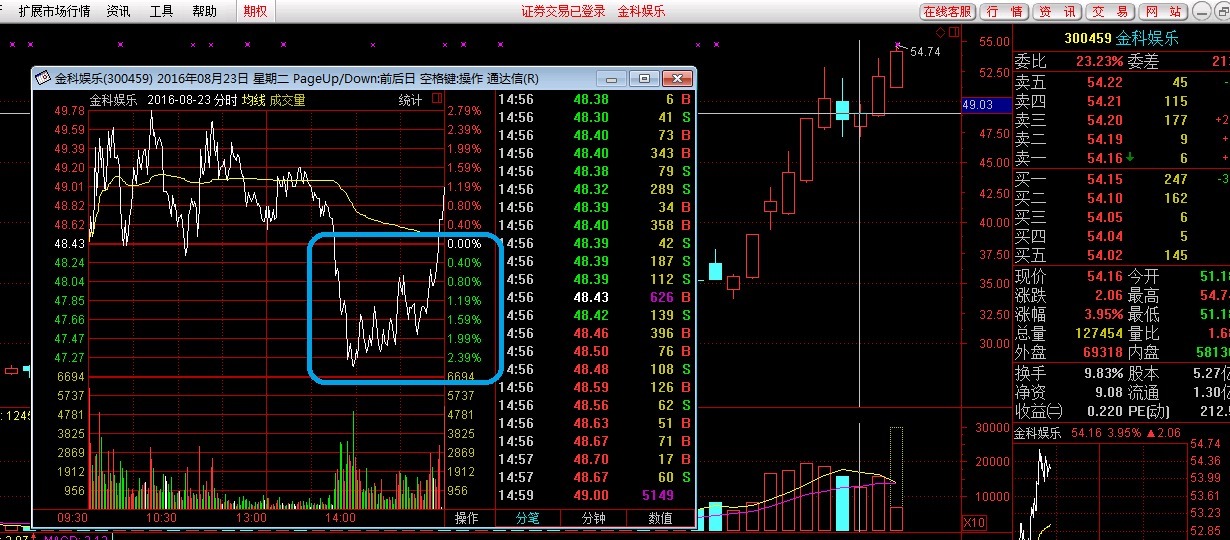 金科娱乐,在这一天收盘就是打压后,然后大量成交,最后收盘给收了回来。