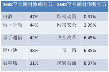 从表中可以看出,截止目前表现最佳的五大题材:白酒、地下管廊、量子通信、锂电池、石墨烯均属于权重较小的板块。主要拖累指数反弹的为央企改革、一路一带、煤炭石油等权重题材板块。其中“网络安全”板块表现差强人意,主要原因为具有核心技术的“量子通信”的应用,适当挤掉了“网络安全”题材的泡沫。