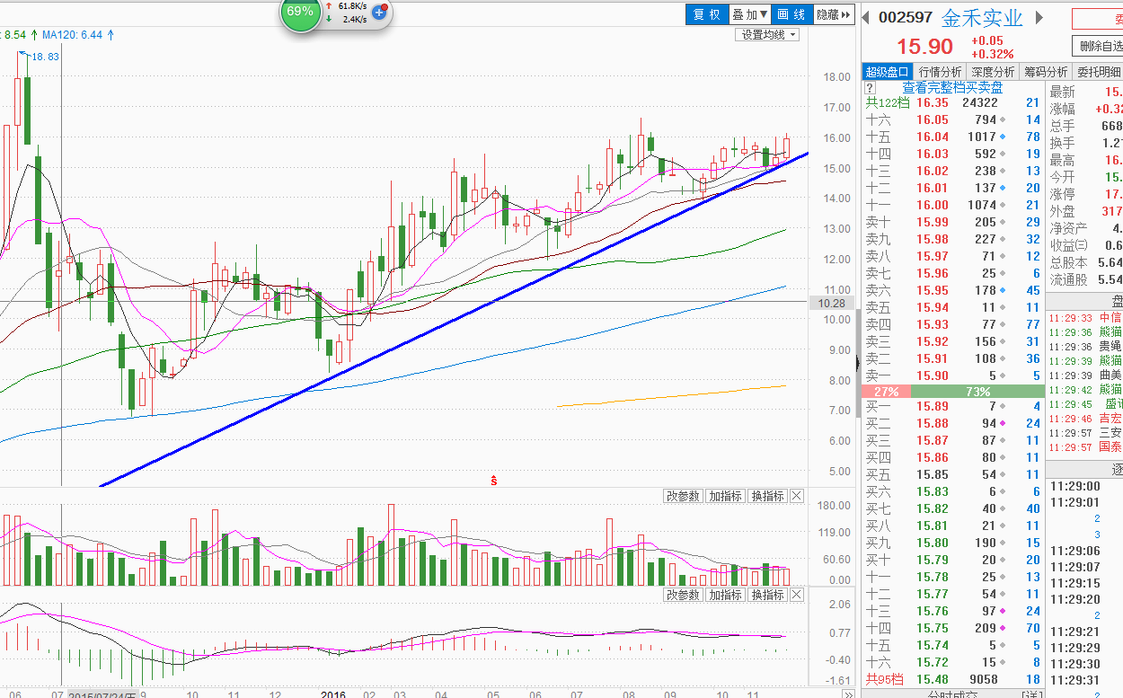 盈利预测预计2016-2018年公司每股收益分别为0.80元、0.85元、1.04元,对应当前股价市盈率为19倍、18倍、15倍,去年业绩多少?2015年每股收益只有0.38元,今年业绩预测double了。这不是绩优小盘白马股吗,按照0.8元的业绩预测,对应合理股价在24左右。公司股本5.64亿,总市值89.7亿,小盘绩优应该成为私募或者公募基金的标配股票,9月30日股东人数显示3.32万,11月15日股东人数显示2.86万,足足少了将近4600人,这对于一只小盘股票来说,人数是骤然减少了14%左右,股价从14.5元涨到目前的15.9元,10%左右,10%就减少了4600人,看来主力是准备大干一场了。