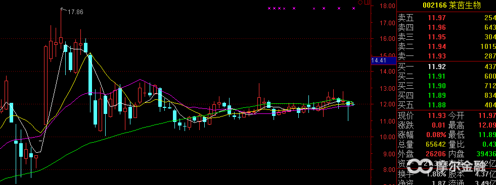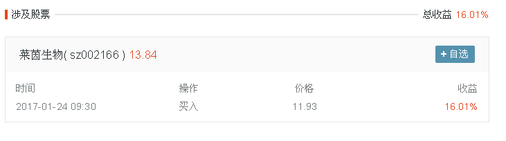 莱茵生物17年1月12日午间公告,近日,公司董事会接到控股股东秦本军先生的一致行动人蒋小三先生通知,其通过集中竞价交易方式增持1,300,000股公司股份,增持完成后,控股股东及其一致行动人的合计持股比例达到公司总股本的20%。粗略的算了一下,增持的价格在12.5左右,增持了1500W左右,而现在的价格还不到12元,由于前期创业板指爆跌的原因,再看看1月16号这一天,一根长长的下影线(锤子线),不愿意再跌破,自己想想个中逻辑。。。