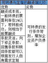 在这种背景下,被定增新规遏制的再融资需求,将会选择可转债作为主要形式。对于发行人而言可转债和定增相比,优缺点都非常明显。