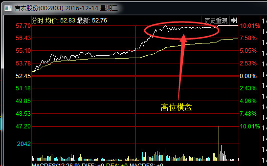 如上图所示,吉宏股份2016-12-14的分时图,下午缓慢拉升到9.4%左右之后开始横盘。横盘的目的是什么?就是让散户换手,提高新一波散户的平均成本。