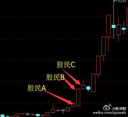 看上图,假设箭头所指的位置分别是股民A、B、C三人的成本线位置。