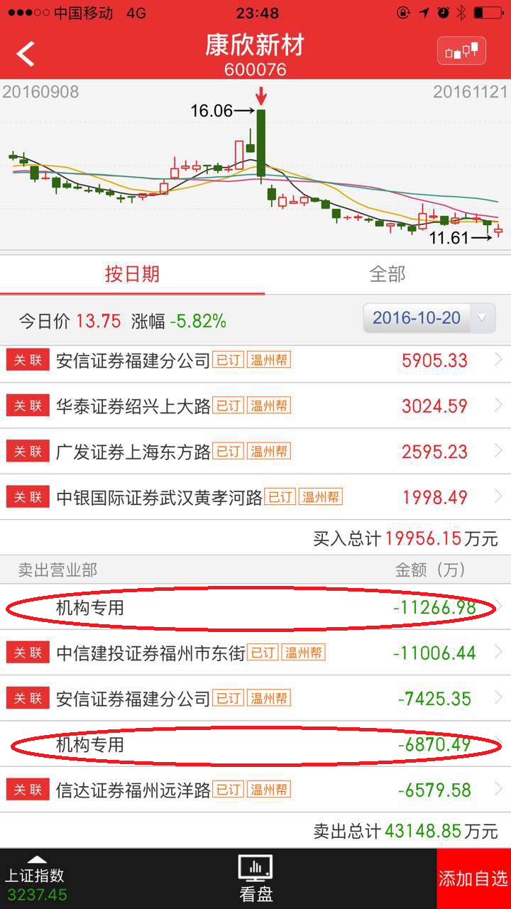 惨案发生在去年10月20日,当时温州帮老大正喜滋滋的用涨停板开盘,准备封一字板,做个比武招亲,然后风风光光的把这个白富美嫁出去,引来了一堆看戏的吃瓜群众。结果里面的机构旧爱不干了,准备彻底和这个白富美分手。集合竞价就开始砸盘,机构股东出货2个亿,白富美出师不利,摔了个大跟头,我也是看的惊心动魄。该股从几乎涨停开盘到收盘暴跌5个点,一根巨大的阴线当头一棒,把准备比武招亲的经纪人和进场捧场的散户给砸晕了。