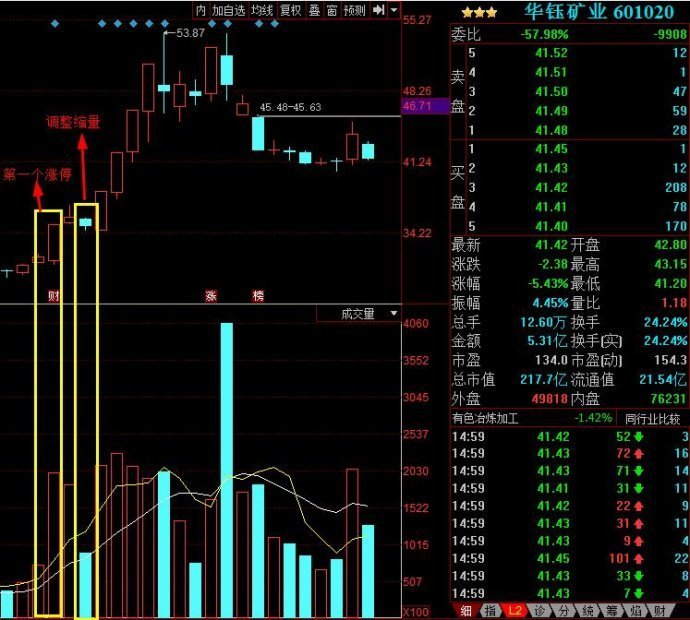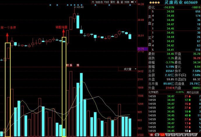 灵康药业,第一个涨停之后横盘调整了16个交易日,这么多天中也出现了符合标准的缩量,当然追极致的缩量是第二个涨停前的一天。