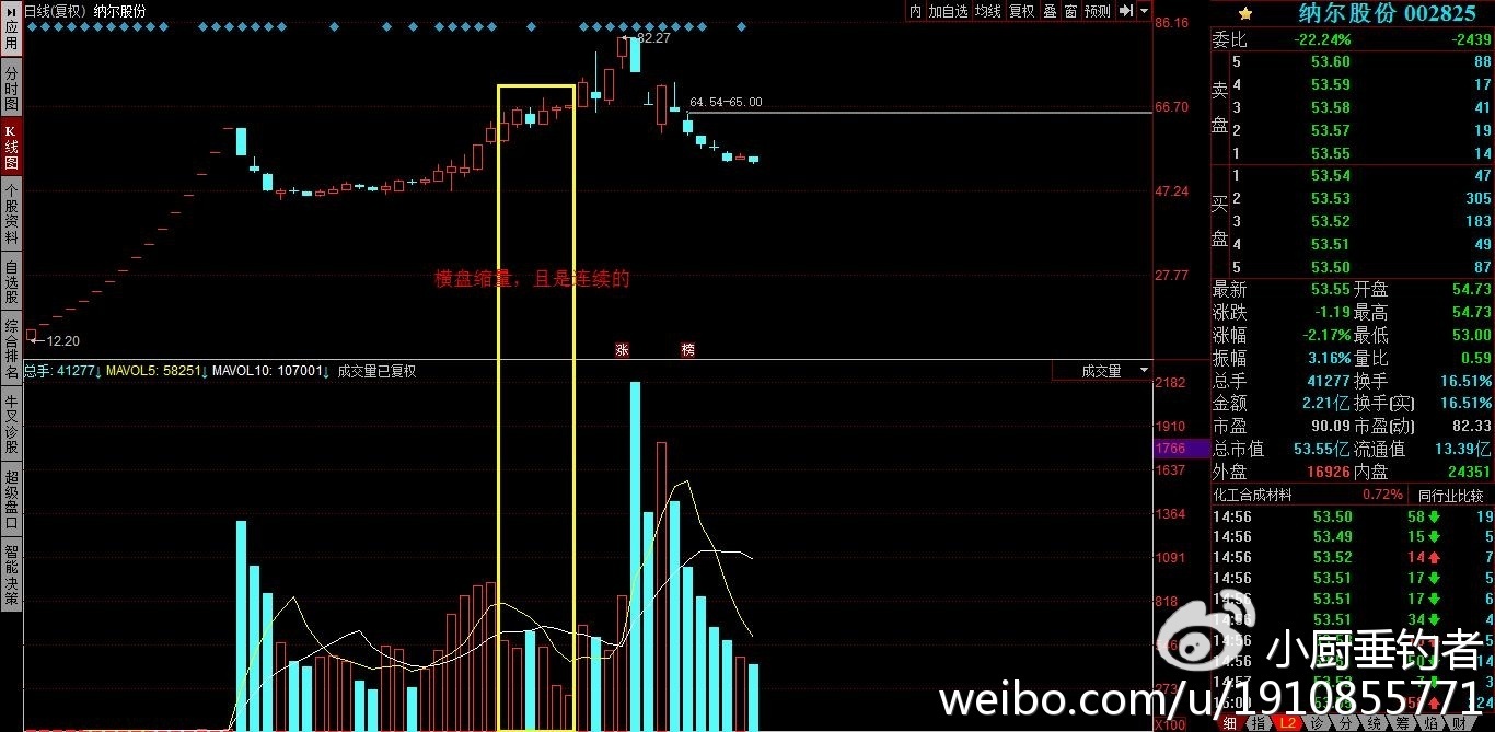3.套利思考:在高位出现横盘缩量,而且主力盘中还有吸筹的现象,说明后市还会有高点。缩量都还不够大,虽然连续缩量在5及10日均量线下,但能够缩在3亿以内是最佳,且有5%左右的回落,那就会是一个介入的时机;现在已经横盘缩量了4天,如果未有回落且缩量3亿内的话,那主力很可能就要拉升。