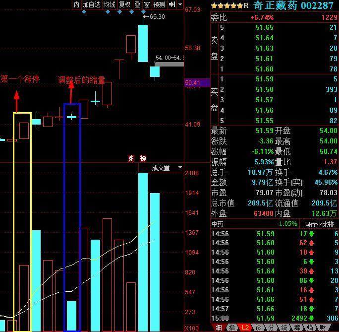 奇正藏药第一个涨停之后,接下来调整了4天,在第4天缩量到极致,次日直接涨停,真正启动了主升浪。