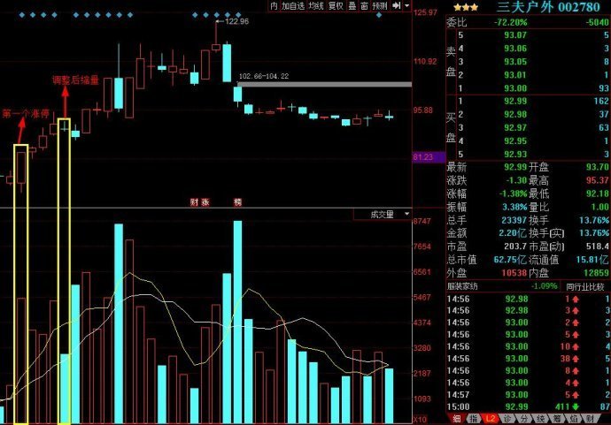 三夫户外,在第一个涨停之后是底部向上的缩量上涨,在第四天缩量到极致后还调整了一天,才开启了主升浪。