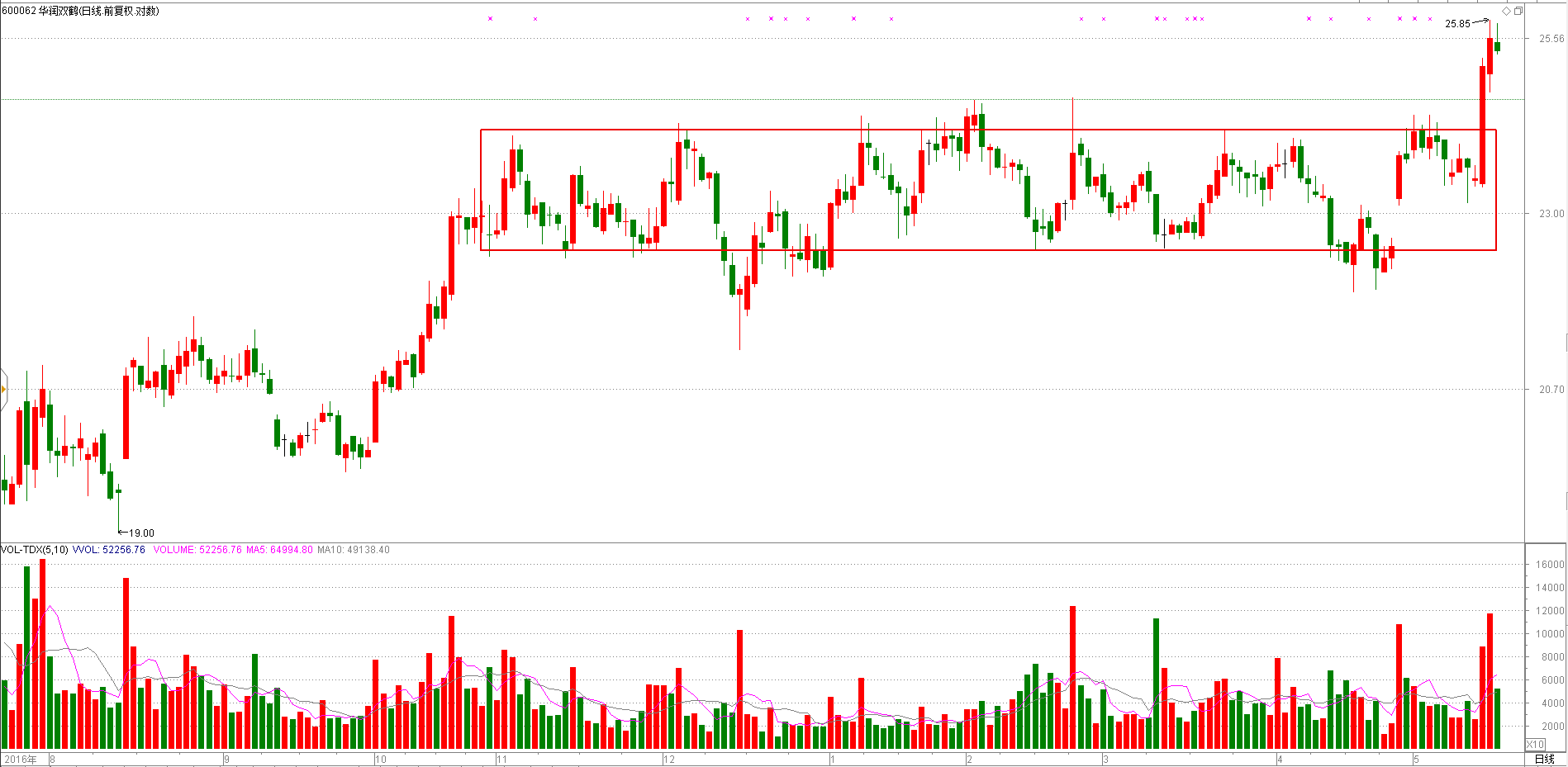 上图是华润双鹤的日线图,从图中很明显的可以看到股价已经有效突破围绕年线整理了八个月之久的盘整区,目前均线已从粘合开始向上发散。而且,从量价关系可以看出,指数在近期整理区间内,向上突破放量,回调缩量。