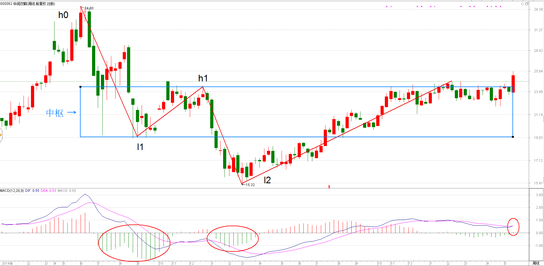 上图是华润双鹤的周线图,从周线级别看,指数在l2的位置发生了背驰,目前已经向上突破中枢,macd也在零轴上方金叉。