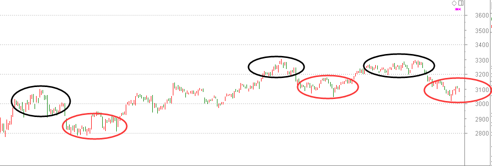 我们看看操纵者是如何操盘,如果指数有心做上去,那么在一个中期头部出来之后,就会在其下方做同样时间甚至更长时间的底部作为消化筹码。