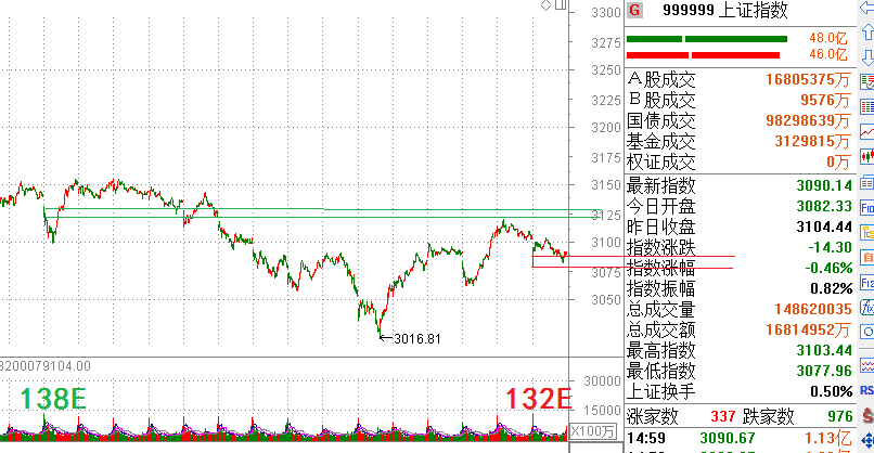 大家看上图,这段时间以来,开盘量唯一能够突破130亿的,只有上图的138E那天和132E的今天。那么这两天就会形成一个支撑与压力,有没有发现昨日的最高点,刚好在138E空方量附近。同样有没有发现下午指数杀到今天多方量附近就拉了上来?