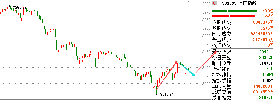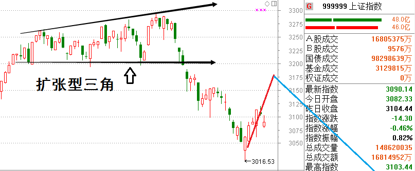 我们来看这种情况的反弹,也许是大部分朋友都希望出现短期不断上涨的情况。这种情况我告诉你,短期指数涨上去,但个股未必跟进的同时,后市会跌幅更深。为什么啊?因为3200上方构建了一个扩张型的三角,这个三角形构造了两个月,也就是上方有两个月的套牢盘,假如短时间指数反弹接近这个位置,那么是不是给上面被套的人看到解套的希望纷纷杀出来?