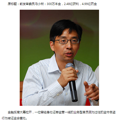 4月21日,证监会新闻发布会通报一起交易所干部违法买卖股票行为。前深圳证券交易所工作人员、股票发行审核委员会兼职委员冯小树被处以没收违法所得2.48亿元,并顶格处以2.51亿元罚款的处罚。同时,证监会对冯小树采取终身市场禁入措施。