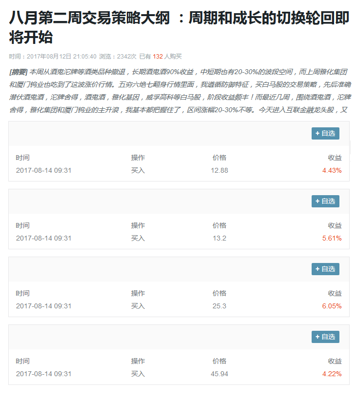[摘要] 上周从酒鬼沱牌等酒类品种撤退,长期酒鬼酒90%收益,中短期也有20-30%的波段空间,而上周雅化集团和厦门钨业也吃到了这波涨价行情。 五穷六绝七翻身行情里面,我遵循防御特征,买白马股的交易策略,先后准确潜伏酒鬼酒,沱牌舍得,酒鬼酒,雅化基因,威孚高科等白马股,阶段收益颇丰! 而最近几周,围绕酒鬼酒,沱牌舍得,雅化集团和厦门钨业的主升浪,我基本都把握住了,区间涨幅20-30%不等。今天进入互联金融龙头股,又是大涨的节奏。 8.15 长线潜伏 : 市场终端调研结果,今日大涨之后更加坚定我长期持股的信心!