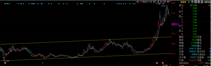 可能看到这些图大家就发现了一个问题,突破通道线上轨的票走的非常凌厉,这种应该怎么操作。突破通道线的上轨一般情况下意味着主升浪的到来。我们举一个近期操作实例来说明,这个股是中国铝业,突破上轨时买入,随后有一个调整的过程,因为技术上不敢确认是否有效突破上轨,为避免股价向下寻找支撑,选择卖出。再次确认突破上轨时,再次买入。