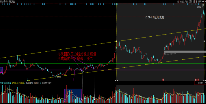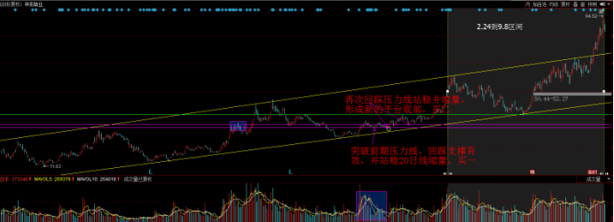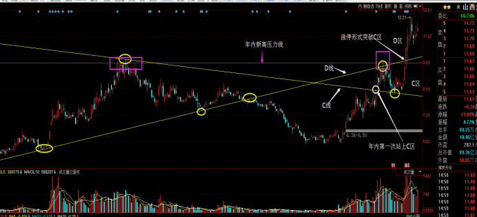 可以看出,在山西焦化今年第一次站上站上C线的时候,是以涨停板的形式突破的,所以直接上涨触碰D线,与之前的高点形成当时的年内新高压力线,随后回踩C线,形成调整后的最低点,再次开始第二波涨幅,在回踩C线的时候没买的话,就要做确定性,即突破D线和年内新高压力线的时候买入。
