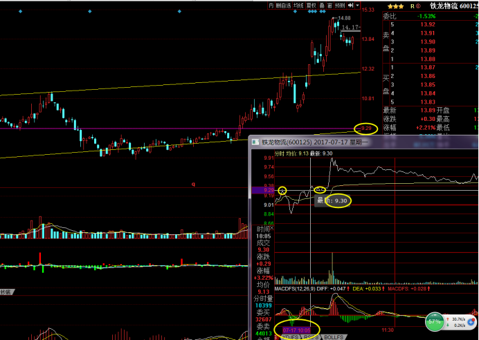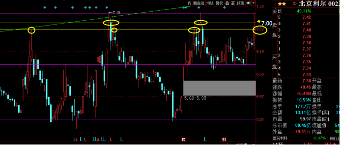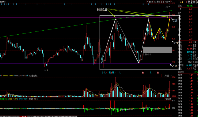 图中白色框框内的三根横线构成了一个箱体,箱体上沿7.18元,下沿5.26,箱体中轴线6.23恰好是图中黄色W型的底部价格,这三个价位所代表了大部分K线的压力,支撑。有意思的是,股价先走N型大箱体,回落到箱体中轴位时找到了支撑,做了个W底,接着翻箱。多么标准的箱体走势,那么翻箱后的目标价就是7.18+7.18-5.26=9.1左右。这个价格是按照翻箱来算的,图中还有根绿色斜线,那是这个股的长期通道上轨,可惜的是周五破板了没站上,不然就实在太完美!