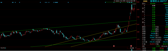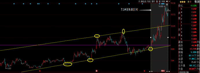 这个图中的黄线不同于之前说的通道线,煤炭和钢铁的走势收益于国家的供给侧改革和业绩爆发,有时效性,所以适合四象限的技术分析法。黄线的连接点取自山西焦化5月份之前的K线,可以看出,5月后K线的走势也完美符合黄线的压力支撑。