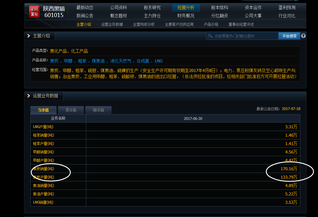 综合这几个条件,发现选出来的只有三只:陕西黑猫,山西焦化,开滦股份。这三个股首先都是煤化工产业链的股票,但是陕西黑猫不是国企的股票,但优点是盘子最小。山西焦化叠加国改,开滦股份在河北,很可能受环保影响。这是当时对他们三个的分析。看了看经营情况,发现一个很重要的问题: