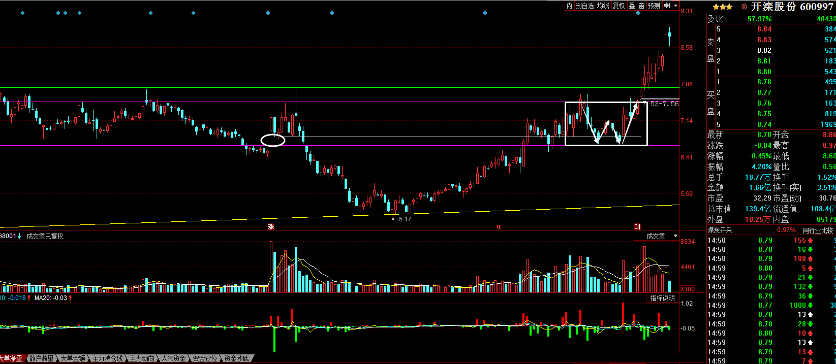 所以从基本面的选择上我就暂定了开滦股份。在第一篇文章《逻辑客的交易法则》详细记录了当时介入山西焦化的原因和技术分析(想要观看的请移步逻辑客的交易法则),下图是我介入开滦的技术分析: