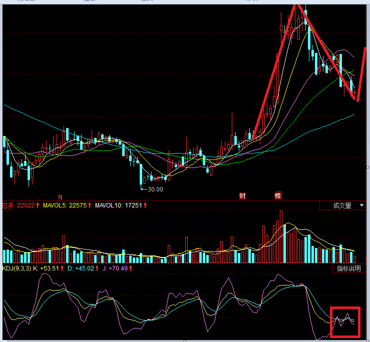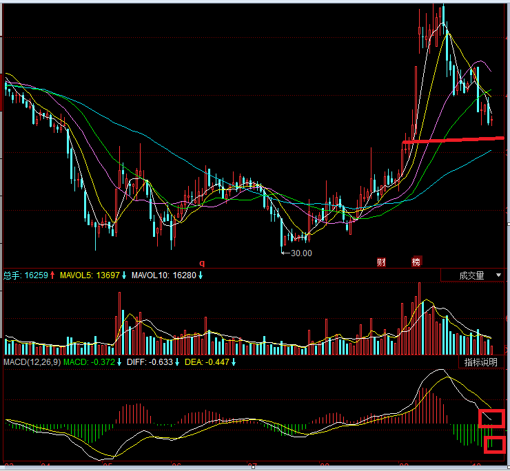 等待MACD绿柱变短,白线掉头向上的时候大胆买入!该股止损位在红色线处,大概价位为:37。