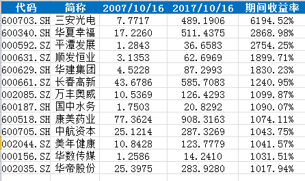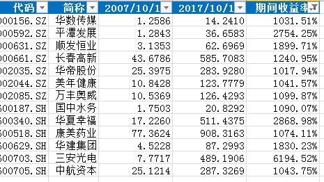 抛开指数看个股,10年间,10倍大牛股很少,10年10倍的牛股都在下面,A股10年期间平均2000只个股,10年期间涨幅超过10倍的只有13只。