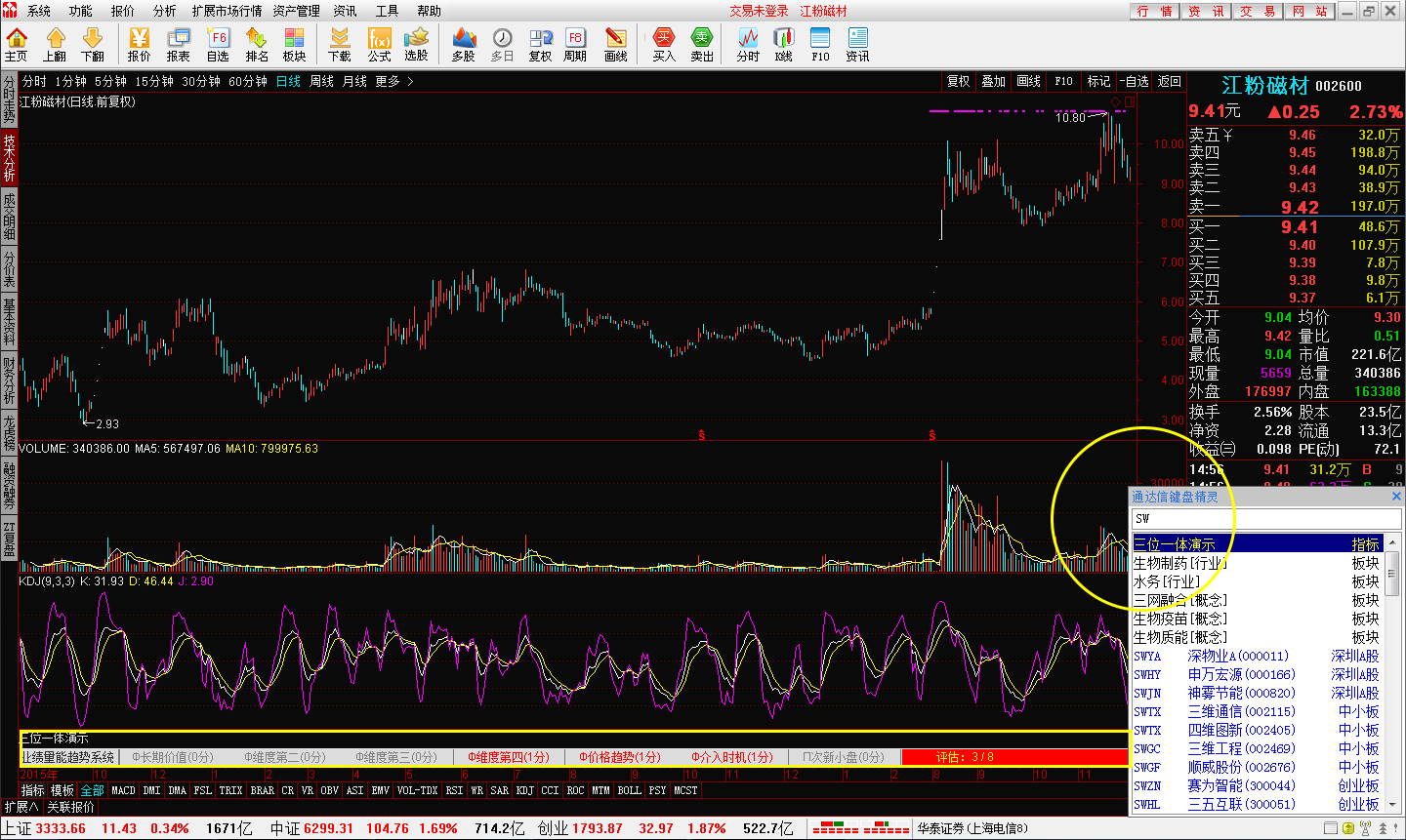 选择一个指标幅图区域,然后使用键盘精灵,输入指标名称首字母。