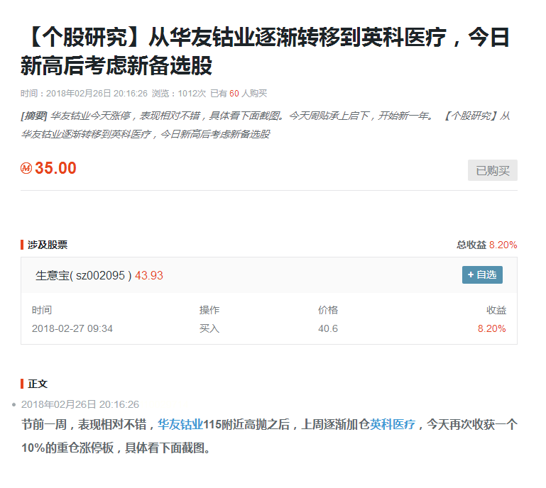 [摘要] 节前一周,表现相对不错,华友钴业115附近高抛之后,上周逐渐加仓英科医疗,昨天再次收获一个10%的重仓涨停板,今天从英科医疗到生意宝,再涨5%,具体看下面截图。 【个股研究】从华友钴业英科医疗生意宝,思考下一个市场潜力品种