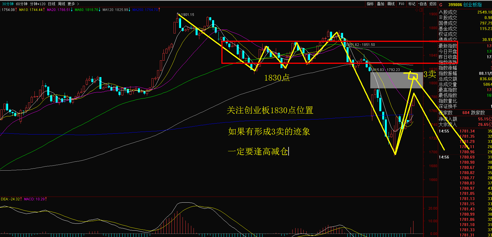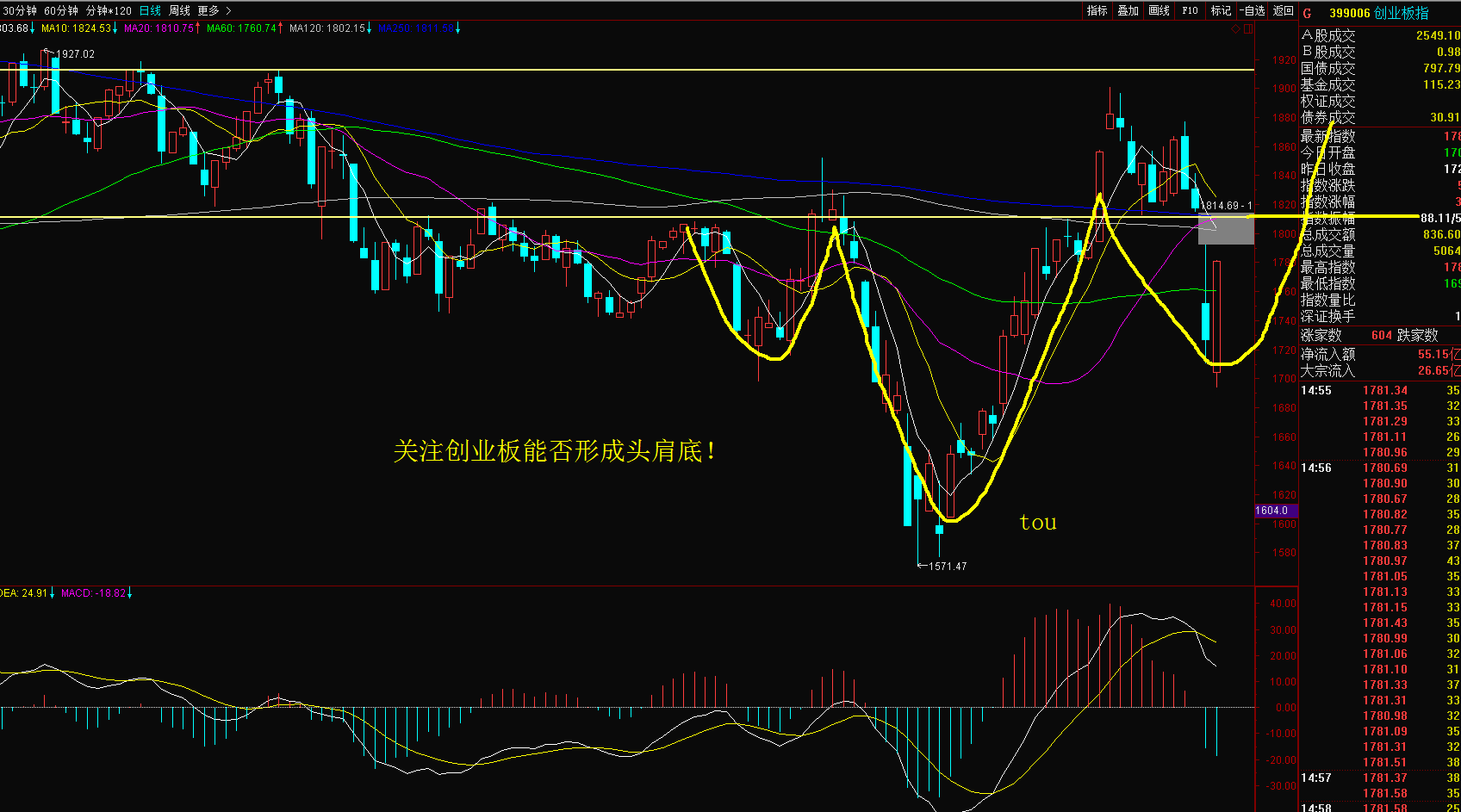 创业板日线和30分钟走势一多一空,说明行情处于纠结状态