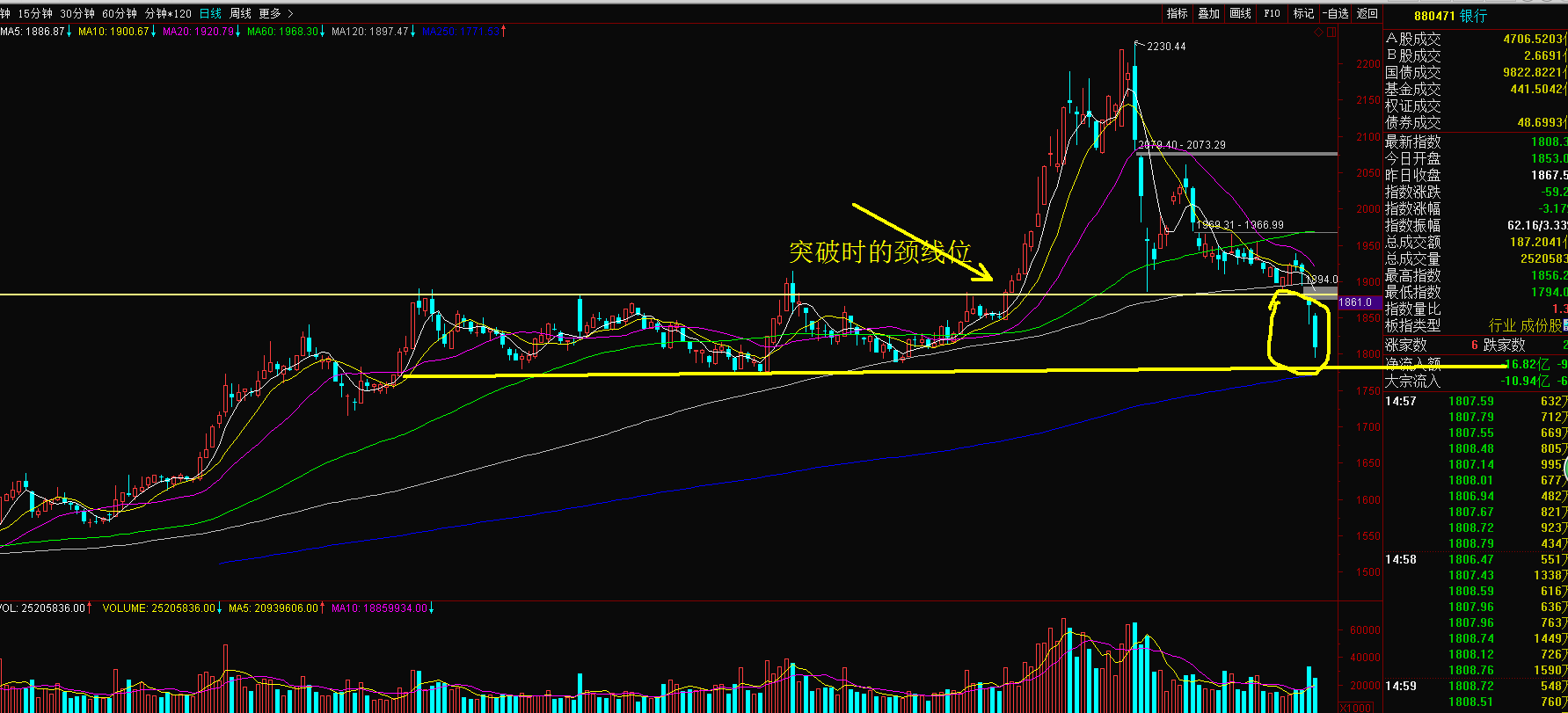 [摘要] 以前大盘持续下跌超过一个月,跌幅超过10%的时候,强势板块非常容易辨认,但是这次竟然找不到明显的强势板块(至少目前是这样),银行板块正式跌破前期盘整区间颈线位置,创业板仍然没有突破最后一个盘整区间,一起都显得那么弱势,一定要控制好仓位!