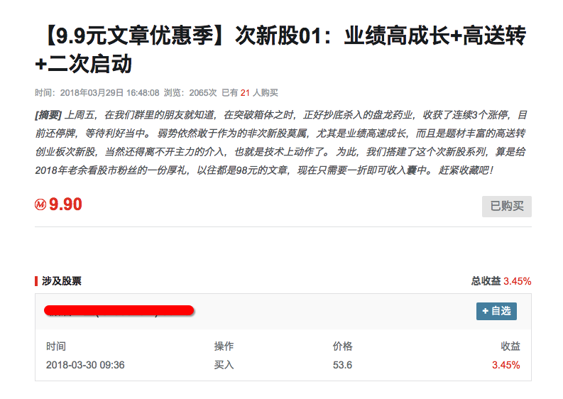 [摘要] 上周五,在我们群里的朋友就知道,在突破箱体之时,正好抄底杀入的盘龙药业,收获了连续3个涨停,今日复牌后再次拉出涨停。 周四晚上推出的次新股系列1,其中的标的,周五当天即上涨4.6%。应广大朋友的要求,我们更加推出接下来的次新股相关标的。 接下来,依然是题材丰富,技术形态特别的技术表现; 搭建这份次系列,算是给2018年老余看股市粉丝的一份厚礼,以往都是98元的文章,现在只需要一折即可得到。 赶紧收藏吧!