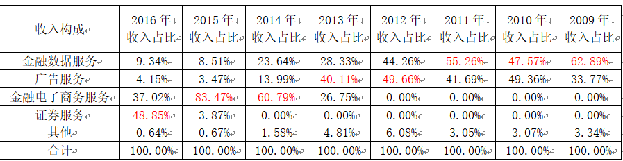 先来看一组数据,从表中可以容易看到,东方财富自2010年上市以来经历3次主营业务转型的,从金融数据服务,转型到广告服务,再转型到金融电子商务服务,最后转型到现在的证券服务。