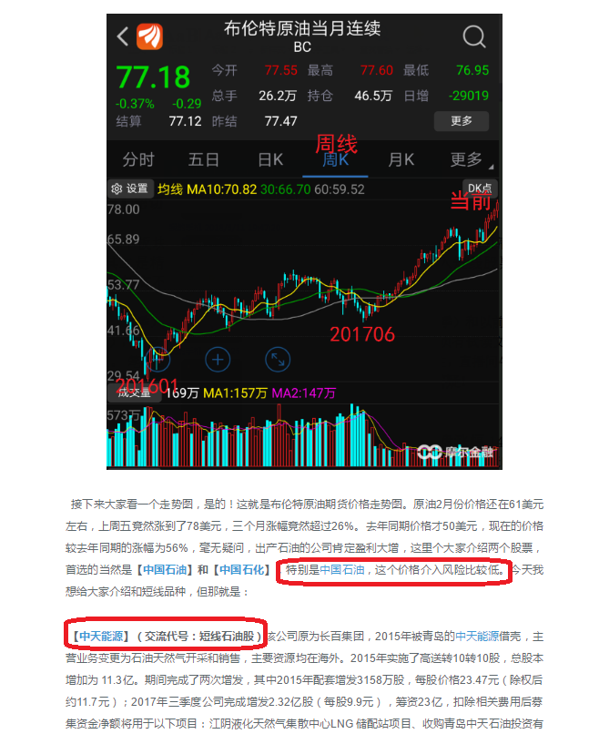 上周笔者文章中主打的石油板块果然是本周最亮眼板块,笔者把当时的布伦特原油K线图贴到文章中,中国石油和中天能源这两只个股(周五都大涨8%,笔者周二实盘都有买入),看中的就是他们的资源。不过本周石油板块涨的最好的却是石油装备行业,其实真正有潜力公司依然是我这2只,希望大家继续关注!短线池中力盛赛车我周一买入当天就涨停,笔者第二天择机卖出,获利5%,随后该股一路下跌,我为什么卖出?请看我后面的案例分析!短线池中的另外一只安井食品表现也不错,本周最高涨幅接近9%,笔者实盘并没有参与。《【5月第二周】》主角涨13神马股份本周表现依然靓丽,继续大涨13%,笔者出后的2周最大涨幅已经达到32%。