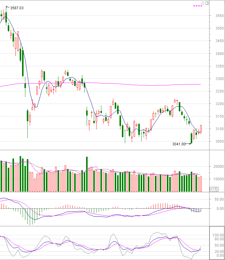 上证日线:沪指今日继续震荡上行,填补前期缺口,站上5日线。量能微幅放大,继续消化情绪。缺口填补,箱体震荡走势概率加大,上方空间,看高3220点附近。MACD拐头趋势明显,即将进入金叉向上格局;摆动指标KDJ金叉后,进一步上行,修复跌势。综合来说,技术形态走势逐步明朗,短期继续看反弹延续。