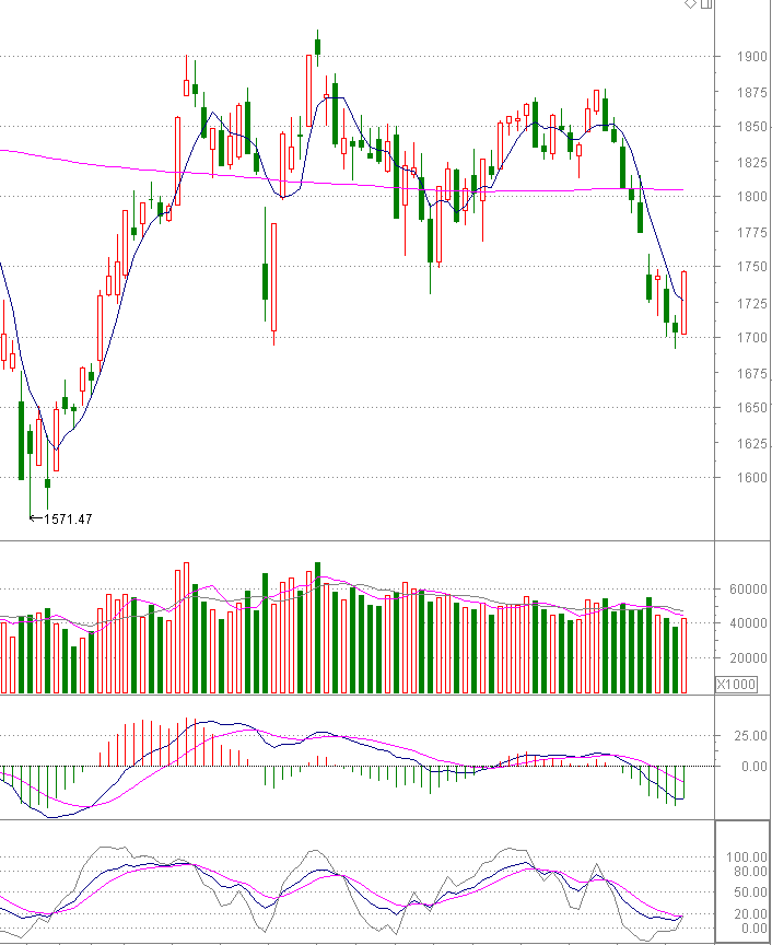 再从创业板指数看:创业板今日暴力反弹,符合研判。几乎收复三日失地,但是量能放大不太明显。目前暂定超跌反弹,短期还待观察逐步放量。MACD角度,今日绿柱缩减明显有拐头向上迹象;KDJ低位超卖后今日刚刚金叉,短期具备反映延续的需求。综合看创业板短期有进一步反弹的趋势。关注上方1775点附近缺口填补。