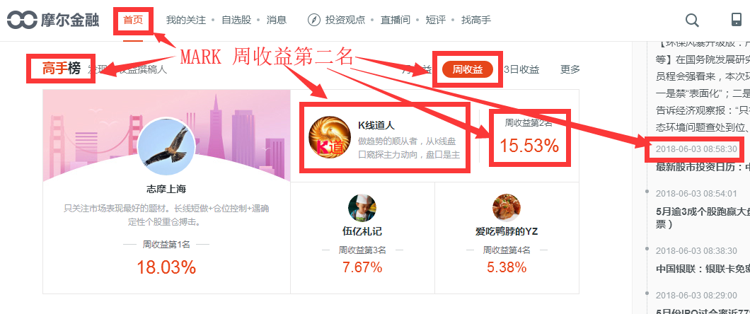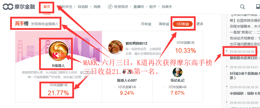 6月初,K道继续用自己的实力打榜摩尔平台投资高手榜,以21.7%的收益率夺得摩尔平台三日收益高手榜第一名,周收益第二名的成绩。有图有真相。