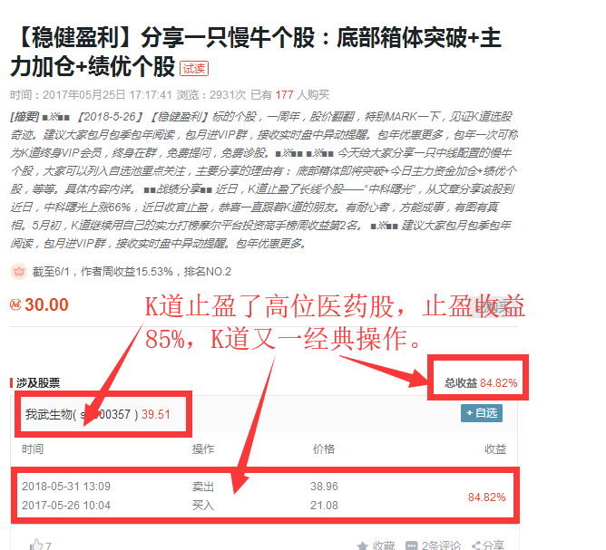 ■■※■■ 近日,K道止盈了中线医药个股——“我武生物”,从文章分享该股到近日,我武生物上涨85%,近日鉴于医药股行情,收官止盈,有图有真相。