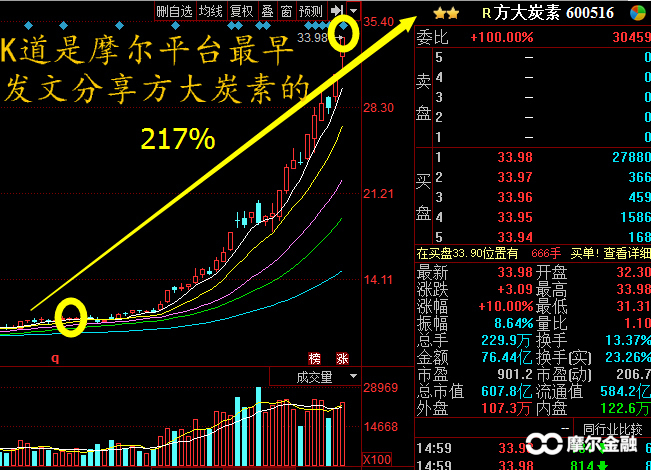 K道是摩尔平台首批发表文章分享方大炭素的。点击查看原文:《【悄悄上涨】发现一只悄悄上涨的个股:绩优 主力大量建仓 涨价驱动》,一个月,收益超过200%。