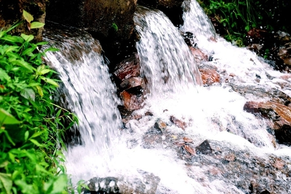 探秘途中沿途凶猛、赤红的赤水,在溯源处成了清澈见底的小溪。阳光下,溪水清澈发亮,捧起一掬送入口中,甘甜弥漫于齿间。
