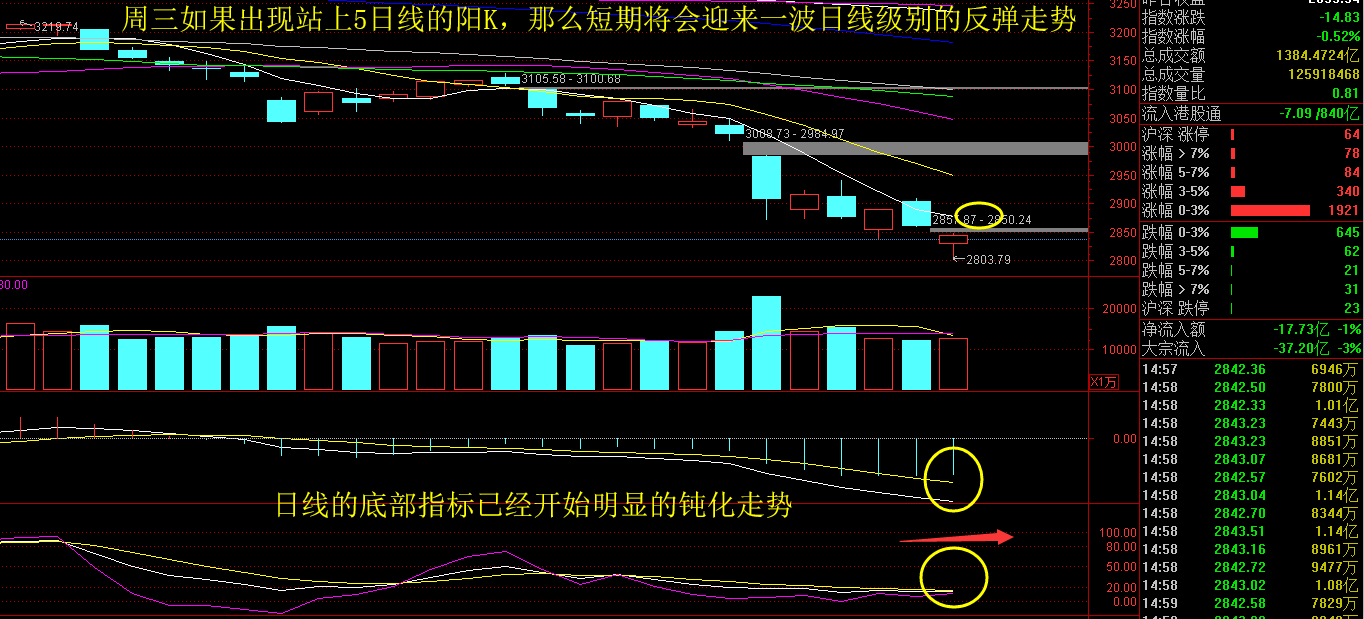 中兴通讯在8连跌停板后,今日终于“稳住了”,这也是导致盘面上科技股反弹的一个主因,毕竟因为太多利空因素导致多数个股2周左右下跌了30%+,这里出现超跌反弹也不足为奇,上证50的持续下跌是目前大盘无法企稳的主要因素,前期护盘的钢铁、水泥等周期股也出现了补跌的走势,暂时来看这里依然还是一个探底的过程,今日在2803.79点走出了一根十字星,那么周三的走势显得尤为重要,如果向上势必出现站上5日线的短期止跌迹象,如果继续向下那这里仍然还有一段跌幅,而这一切的关键因素,还是要看蓝筹股是否能止跌了,毕竟创业板都开始反弹了,指数继续向下就确实有点让人无语了。