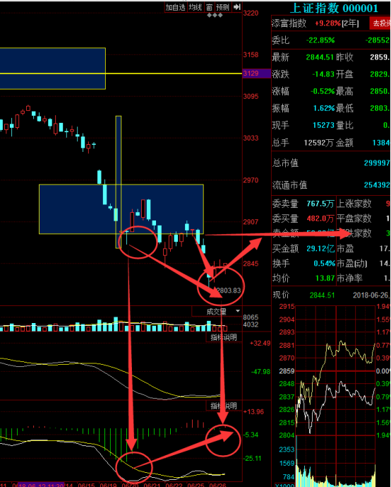 6月20日文章已经分别对上证指数和创业板指数的走势趋势中枢作出了明确的划分,今日回看可以清晰的看出,上证指数已经形成大级别的底部背离的形成,如下图所示:K线离开中枢位点后继续下移,但对于MACD整体走势,趋势形成一个底背离的走势状态,因此可以明确判定,上证指数已经形成止跌反弹的动力。