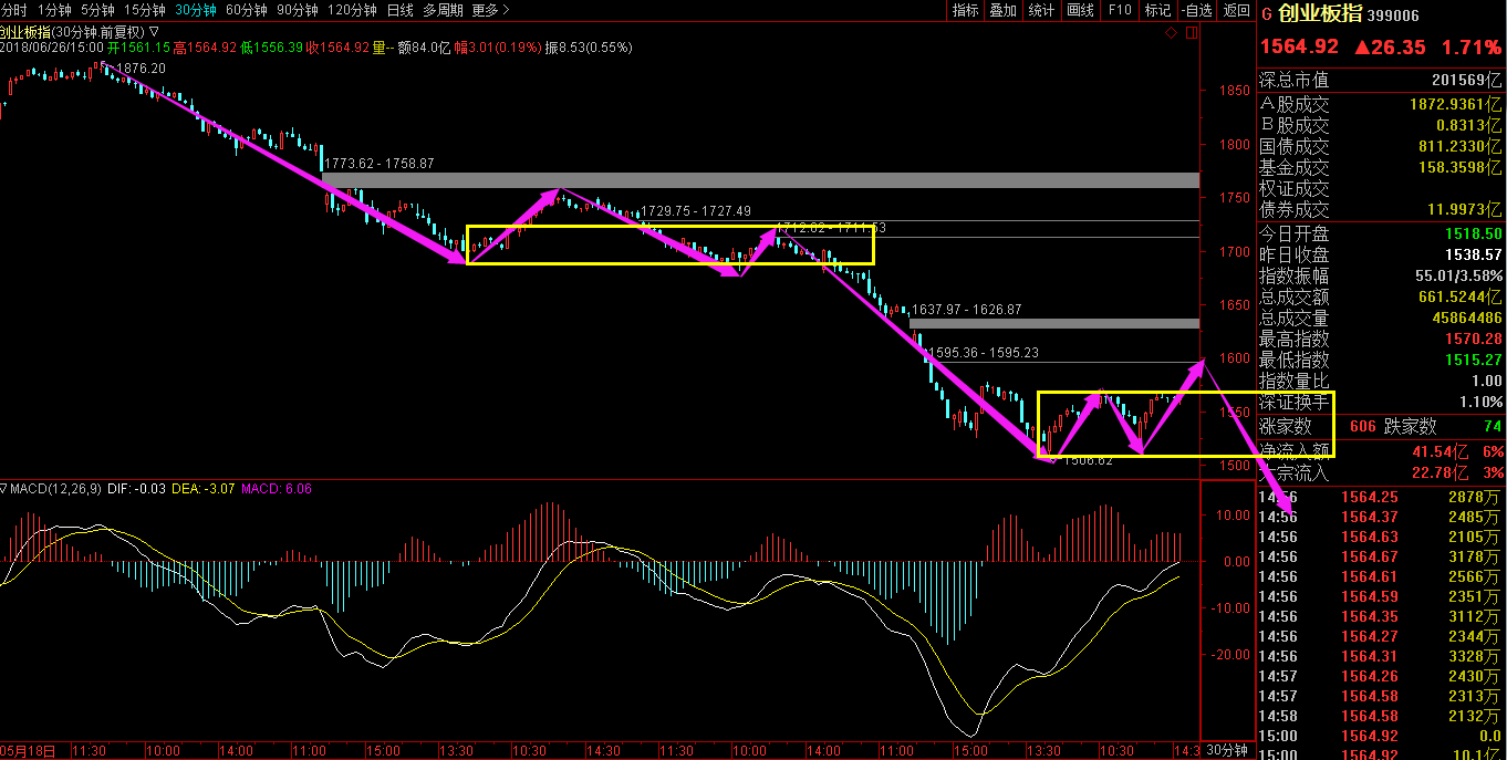 创业板指30分钟还差一笔下降笔,到底是否破新低现在还不得而知,跟随盘面来做