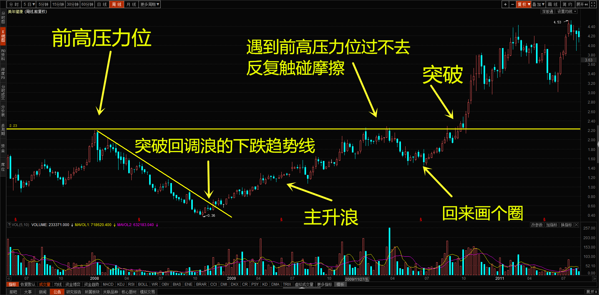 突破下跌趋势线的主升浪遇到前高不过去可以减仓或者离场,站稳黄色横线压力位就是突破买入点。