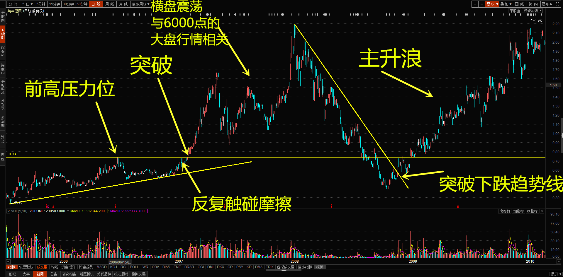 这个票刚上市时赶上了一波大盘6000点的牛市,K线受大盘影响。突破前高是比较好的买点,上升三角形是看涨的技术形态,突破下跌趋势线是比较好的介入机会。