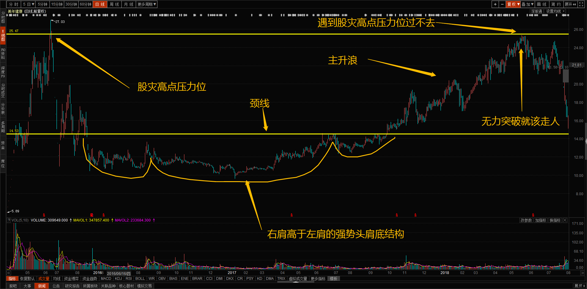头肩底分为三类,这个股票的头肩底是三类中最强势的头肩底底部结构,突破黄色横线时就是买入点。股灾高点有套牢盘,最近遇到股灾高点压力位过不去就应该走人,否则就是连续下跌,医药股是郭嘉队控盘,其他个股也有类似的走势,比如双鹭药业。