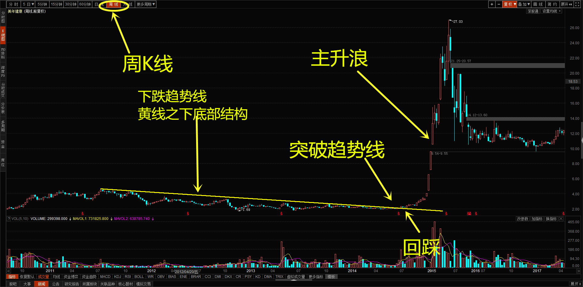 除了年线,下跌趋势线一旦突破也是买入的良机,其中趋势线之下是底部结构,由于连续下跌,主力可以拿住,普通散户很难拿住,最好的做法是黄线之下别碰,突破黄线买入,回踩加仓。