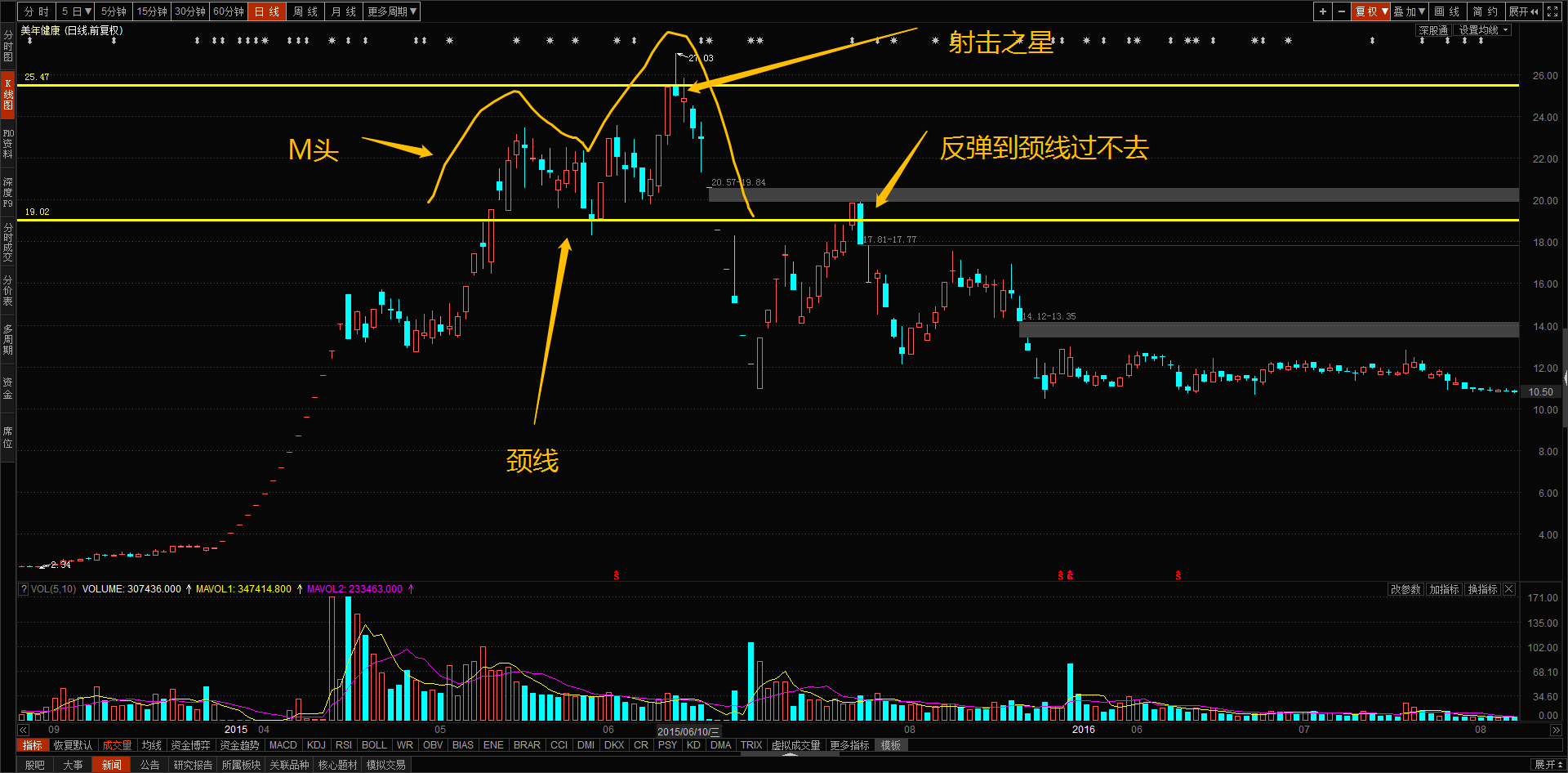 M头是主力在出货,其中最高点是射击之星,大家可以学习一下这个见顶的K线。M头的颈线一旦跌票就成了压力位,反弹到颈线位站不会去就该走人了。