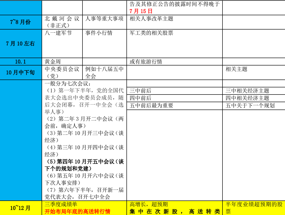 就今年下半年的节点来说,与这份表格对照,有几个重大变化:一个是我上面说的高送转失灵,或者至少不如以往表现那么优异;二是由于年初就召开了三中全会,且核心议题是机构改革,以往传统上重大经济议题并没出现在三中全会,因此,大概率今年10月将要召开的四中全会就承担了重大经济改革的使命。